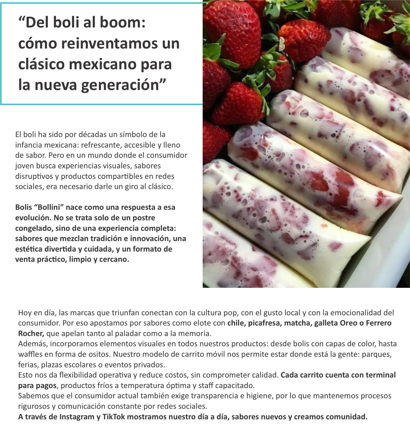 En un mundo donde lo artesanal y lo gourmet se encuentran con lo divertido, nace Bolinni, una propuesta única de bolis gourmet pensada para quienes buscan algo más que un simple postre congelado. ¿Por qué elegir lo común cuando puedes saborear lo extraordinario? En Bolinni nos apasiona transformar sabores tradicionales en experiencias modernas, utilizando ingredientes naturales, recetas auténticas y combinaciones inesperadas. Nuestros bolis no solo refrescan: cuentan historias, despiertan emociones y te hacen sonreír desde el primer bocado. En esta primera etapa, lo que queremos es darte a conocer. No venimos a venderte algo de inmediato, sino a compartir una idea: la de que lo simple puede ser sorprendente, que un postre puede ser arte, y que cada sabor puede hacerte viajar. Desde bolis de carajillo con vainilla mexicana, hasta opciones veganas de maracuyá con chile en polvo, en Bolinni hay un sabor para cada personalidad. Síguenos en Instagram o TikTok, donde compartimos videos detrás de cámaras, colaboraciones con chefs y clientes felices, e ideas para disfrutar Bolinni en casa o en eventos. Descubre el universo gourmet de los bolis que están cambiando las reglas del juego. Bienvenido a Bolinni: más que frío, con mucho estilo. 💭 THINK: ¿Qué hace a un boli gourmet? Descúbrelo con Bolinni Quizá te estás preguntando: ¿qué tiene de especial un boli gourmet? No es solo que se ve bonito en Instagram (aunque sí, ¡también lo es!). Es la diferencia entre lo genérico y lo hecho con intención. En Bolinni, cada receta se formula con detalle para lograr sabores intensos, texturas suaves y un equilibrio perfecto entre lo artesanal y lo innovador. Aquí no usamos saborizantes artificiales ni colores sintéticos. Nuestros bolis son elaborados con frutas frescas, especias naturales, infusiones y licores reales. Y sí, también pensamos en todos: opciones sin azúcar, veganas y con ingredientes funcionales como matcha, jengibre o cúrcuma. Si estás considerando ofrecer un postre diferente para tu cafetería, evento privado o simplemente quieres algo especial en tu congelador, Bolinni puede ser tu aliado ideal. En nuestro blog encontrarás comparativas, sugerencias para maridar sabores y recetas creativas para acompañar nuestros bolis. Piensa en Bolinni como una pequeña revolución congelada: elegante, deliciosa, y pensada para quienes quieren más. 🛒 DO: Compra tu experiencia Bolinni – Envío a domicilio y atención personalizada ¿Estás listo para probar algo diferente? En Bolinni hemos hecho que el proceso sea fácil, seguro y delicioso desde el clic hasta el primer mordisco. 👉 Puedes ordenar en línea directamente desde nuestro sitio web. Elige entre cajas mixtas, sabores especiales por temporada o armar tu propia selección. Nuestro sistema de envío está diseñado para conservar el producto en perfectas condiciones gracias a empaques térmicos y entregas rápidas. Además, si estás planeando un evento, boda, cumpleaños o lanzamiento de marca, te ofrecemos opciones personalizadas con tu logo, sabores exclusivos y atención VIP. Los pasos para comprar son simples: Entra a nuestra tienda en línea. Elige tu caja favorita. Selecciona tu método de entrega. ¡Y prepárate para disfrutar! Aceptamos pagos seguros y ofrecemos servicio al cliente por WhatsApp para cualquier duda. En Bolinni no solo vendemos bolis, vendemos momentos felices. ❤ CARE: Gracias por elegir Bolinni – La familia del sabor consciente Si ya probaste Bolinni, queremos decirte algo muy simple: ¡GRACIAS! Sin personas como tú, que valoran el sabor, la calidad y la creatividad, nuestro proyecto no sería posible. Ahora que eres parte de la comunidad Bolinni, te invitamos a quedarte cerca. Al registrarte en nuestro boletín, recibirás contenido exclusivo: recetas para hacer cócteles con bolis, acceso anticipado a nuevos sabores, cupones de descuento, y regalos de temporada. También puedes unirte a nuestro programa de recompensas, donde cada compra suma puntos que se convierten en descuentos o regalos sorpresa. Y si compartes tu experiencia Bolinni en redes sociales usando el hashtag#MomentosBolinni, puedes aparecer en nuestro sitio y ganar premios mensuales. Además, estamos aquí para ti. ¿Tuviste un problema con un pedido? ¿Tienes una idea de sabor? ¿Quieres colaborar como distribuidor o embajador de marca? Escríbenos. En Bolinniescuchamos, respondemos y mejoramos gracias a ti. Porque más allá del producto, creemos en la comunidad, en la retroalimentación y en seguir creando algo hermoso juntos.